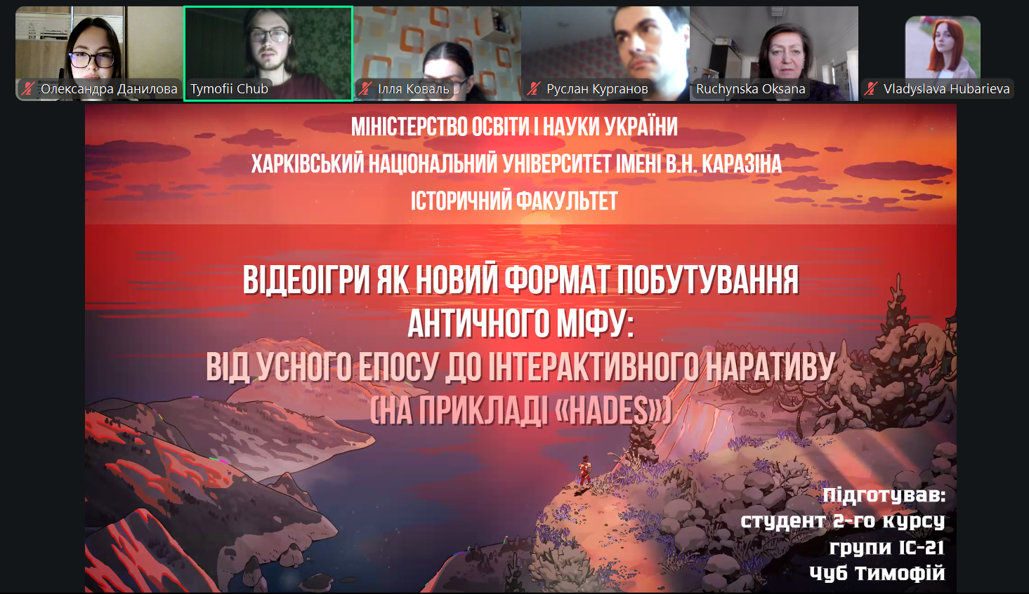 Під час засідання було заслухано доповідь студента ІІ курсу Тимофія Чуба на тему «Відеоігри як новий формат побутування античного міфу: від усного епосу до інтерактивного наративу (на прикладі гри "Hades")». На початку доповіді було зазначено, що античний міф у давньогрецькому суспільстві функціонував передусім як елемент усної традиції, ключовою характеристикою якої була варіативність: кожне нове виконання міфу передбачало можливість інтерпретаційних змін, доповнень та переосмислень. Водночас було наголошено, що з письмовою фіксацією міфів їхня динамічність втратилась. Сучасні відеоігри структурно відтворюють механізми функціонування усної традиції, відроджуючи втрачену варіативність міфу вже в інтерактивному форматі. На прикладі гри «Hades» доповідач розглянув сюжетну лінію, образи основних персонажів та ігрові механіки, відзначивши, що центральним героєм гри є Загрей, син Аїда, а сама розповідь вибудовується навколо його спроб залишити підземний світ. Доповідач зауважив, що циклічність ігрового процесу, множинність діалогів і варіантів розвитку подій формують новий тип наративу, в якому кожне «проходження» є своєрідною варіацією міфу.