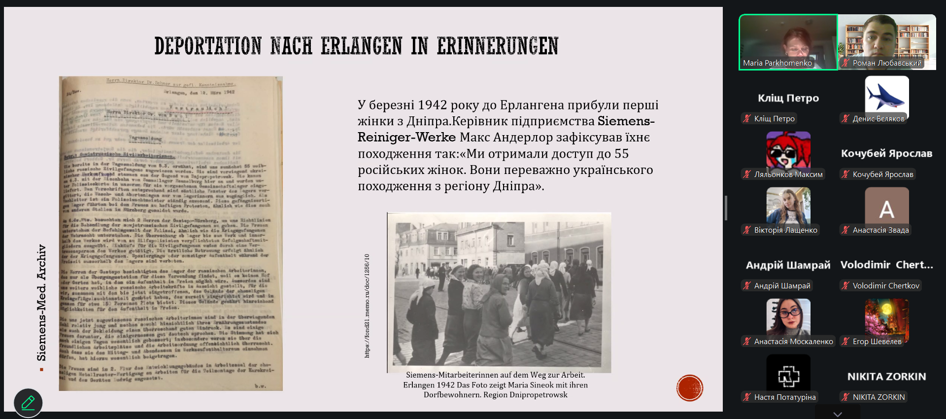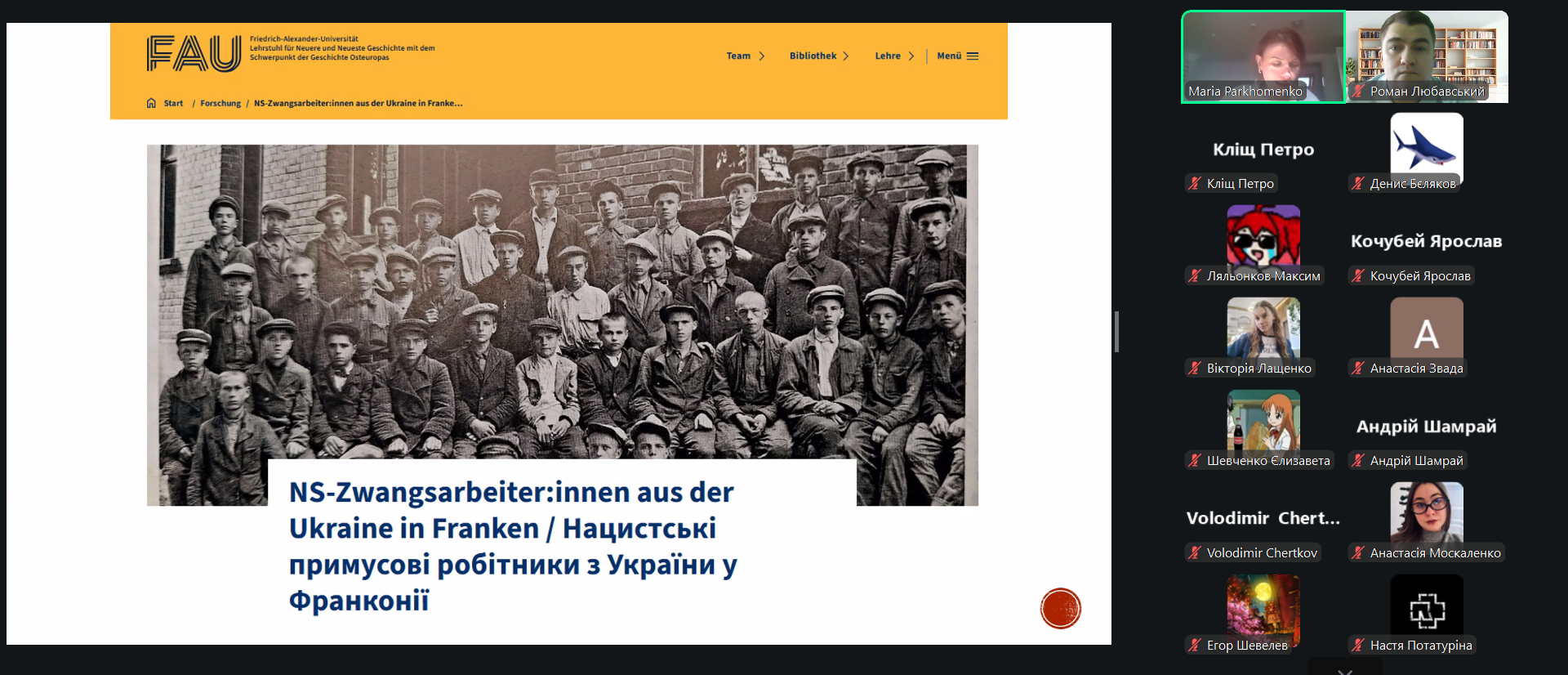 Під час лекції також було представлено дослідницький та виставковий проєкт «NS-Zwangsarbeiter:innen aus der Ukraine in Franken / Нацистські примусові робітники з України у Франконії», започаткований у 2022 році. Проєкт поєднує архівні дослідження, цифрові бази даних та роботу з персональними історіями людей, вивезених до Німеччини на примусові роботи.