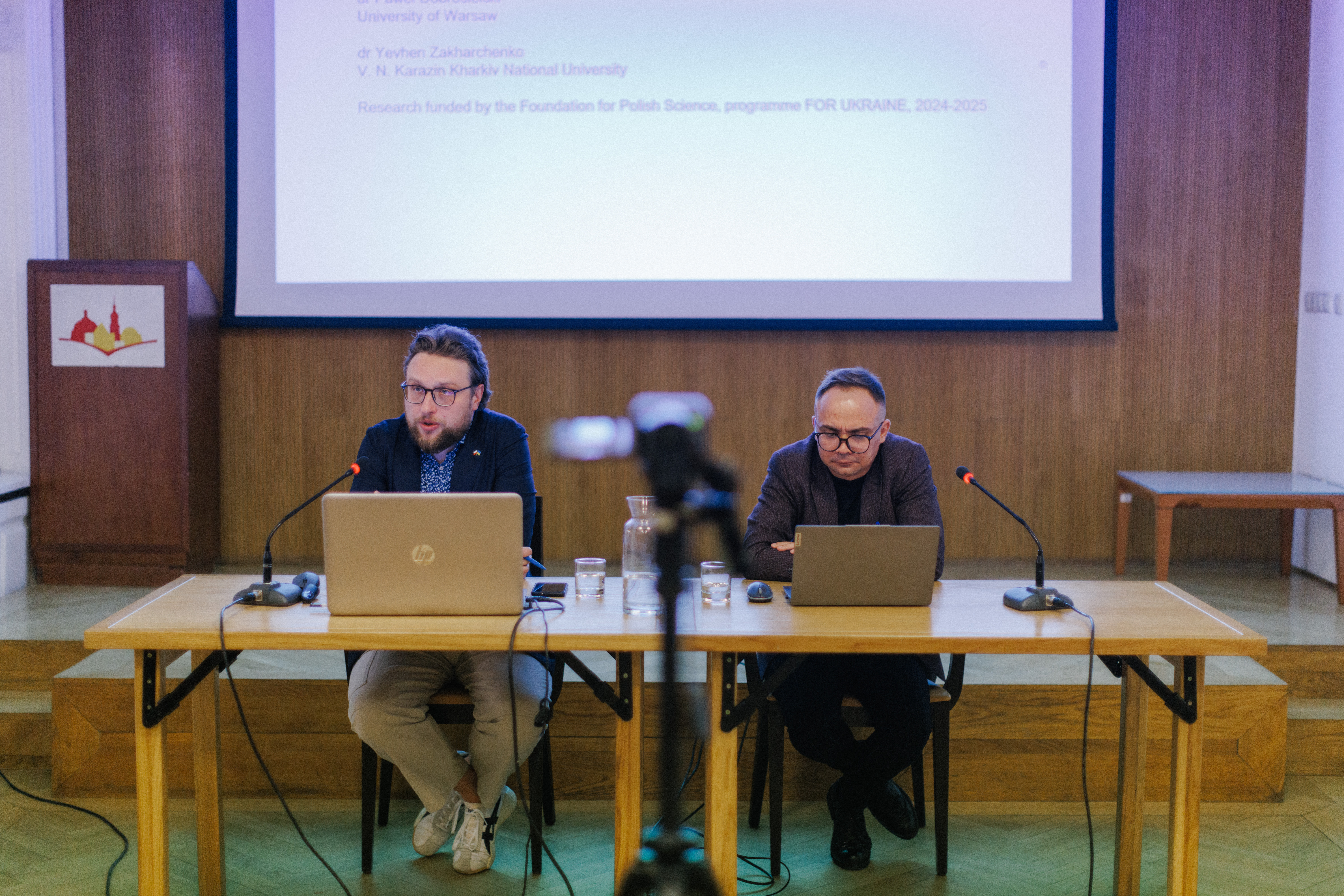 У межах першої панелі з презентацією дослідницького проєкту виступив доцент Євген Захарченко. Проєкт, що реалізується у співпраці з Др. Павелом Добросельським (Інститут польської культури Варшавського університету) і присвячено аналізу й інтерпретації історичних аналогій у сучасному українському суспільному просторі.