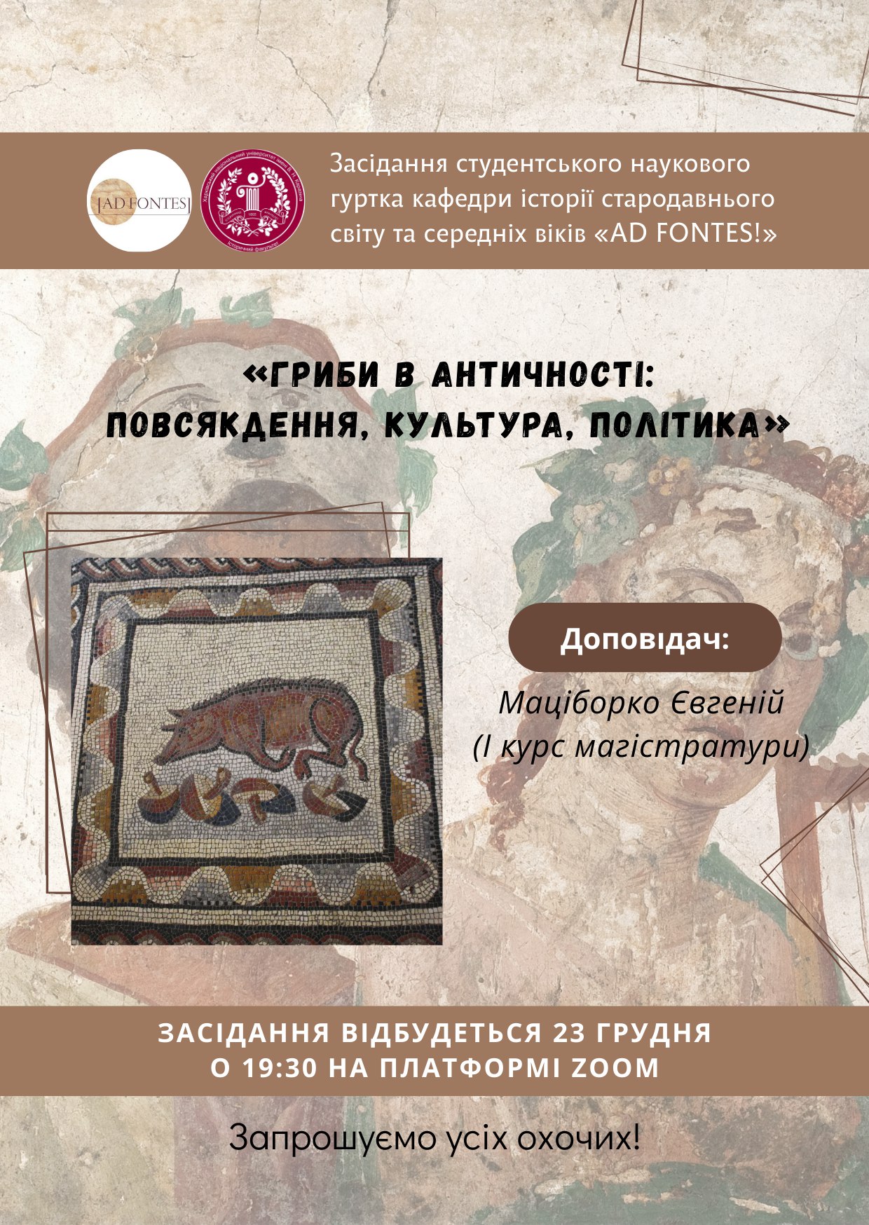 Запрошуємо усіх охочих на чергове засідання гуртка кафедри історії стародавнього світу та середніх віків «Ad Fontes!»Зустріч буде проводитися дистанційно, на платформі ZOOM.