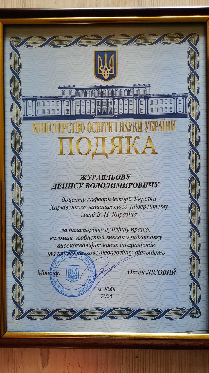 Доцента кафедри історії України Дениса Журавльова нагороджено "Подякою Міністерства освіти і науки України"6 лютого 2026 року з нагоди 221-ї річниці від дня відкриття Харківського національного університету імені В. Н. Каразіна, відбулося урочисте засідання Асамблеї вчених рад за участю керівництва, представників професорсько-викладацького складу, студентства, друзів університету та почесних гостей.